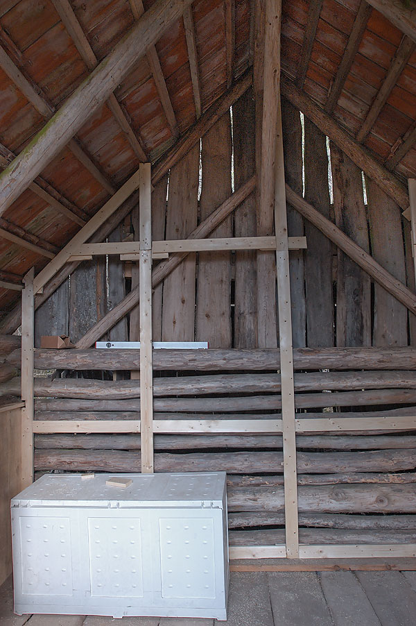 Die rückwärtige Stadelwand wird mit eine Hartholzfaserplatte verschalt. Auf die Rundlinge wurde ein Rahmen aufgebracht. Darauf die Faserplatte bis unter das Dach verlegt. Fotos vom fertigen Zustand fehlen (wegen Dunkelheit). |